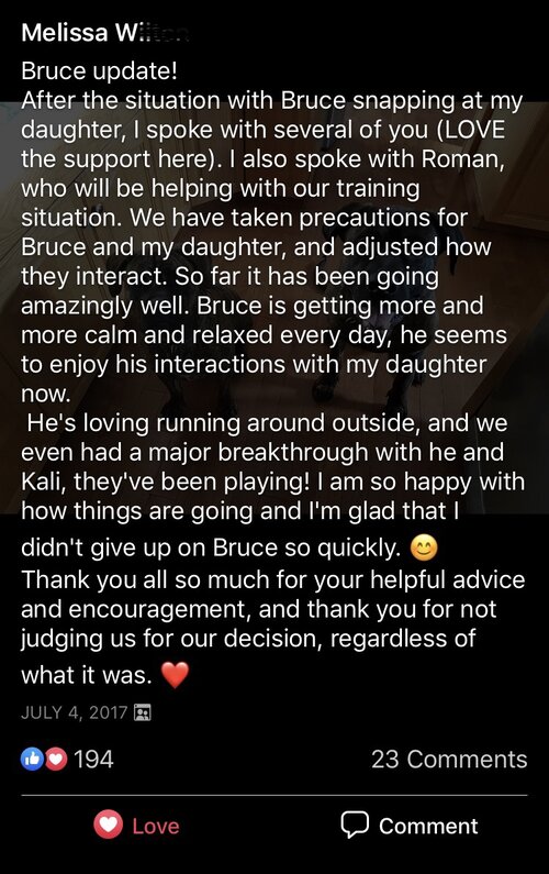 This is one of those moments that I will never forget. I was devastated, completely heart broken. I didn’t know what to do. I felt like a failure. I had failed my new dog and I had failed my daughter. After everyone was calm, I went to the living room and sat on the floor. Bruce came over to me and put his head against mine and I cried. I didn’t know what I was supposed to do, but I didn’t want to lose Bruce. I didn’t want to be another home that abandoned him.